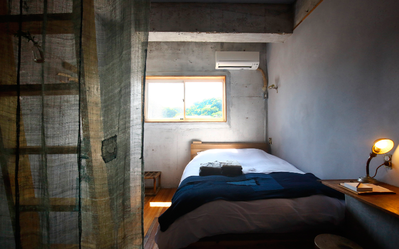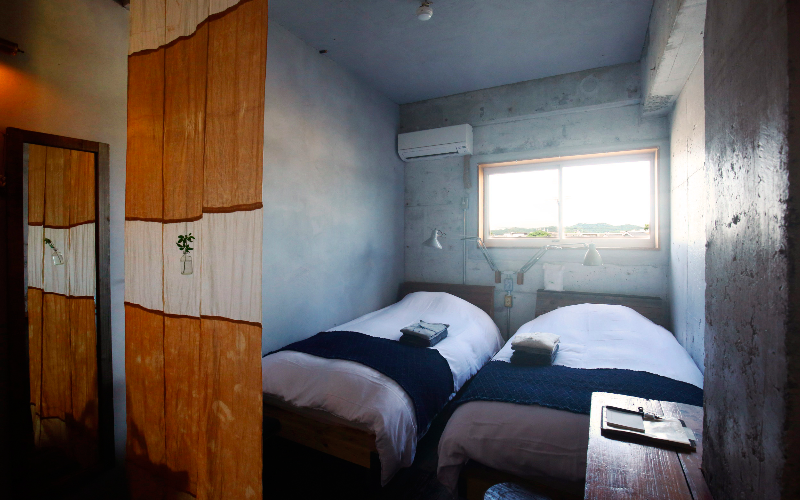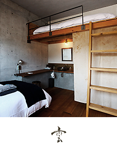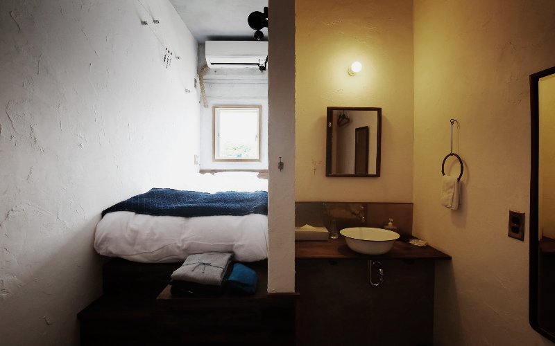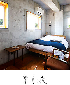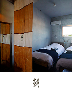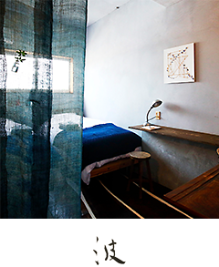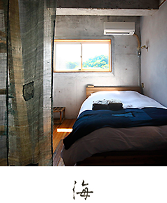 Les murs atypiques de cette chambre contiennent un peu de sable de la mer d’Inamuragasaki, notre région natale, qui fait briller la pièce d’une lumière chaleureuse au moment du coucher du soleil.